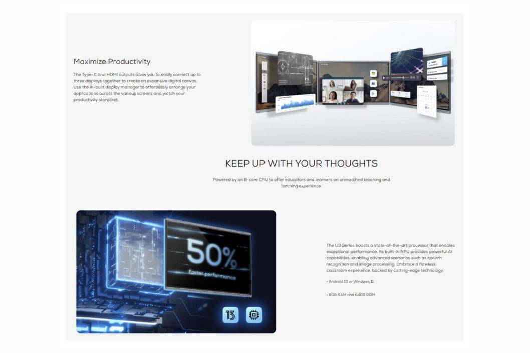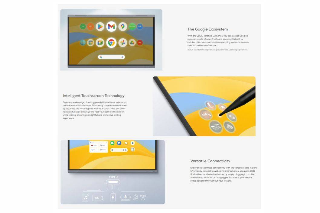 MAXHUB Edu U Series telah disesuaikan dengan kebutuhan tersendiri dalam dunia edukasi, seperti firmware terbaru untuk persiapan kelas, terdapat pula di dalamnya software pengajaran MAXHUB Class. Selain itu, MAXHUB Edu U Series telah tersertifikasi Google dan bisa dengan mudah terkoneksi dengan perangkat IFPD guna mempermudah guru dalam mengendalikan apa yang ditayangkan di layar, kemudian juga kemampuan untuk murid dapat share screen and share ideas secara wireless, serta dapat melakukan remote untuk mengatur seluruh perangkat di masing-masing institusi.