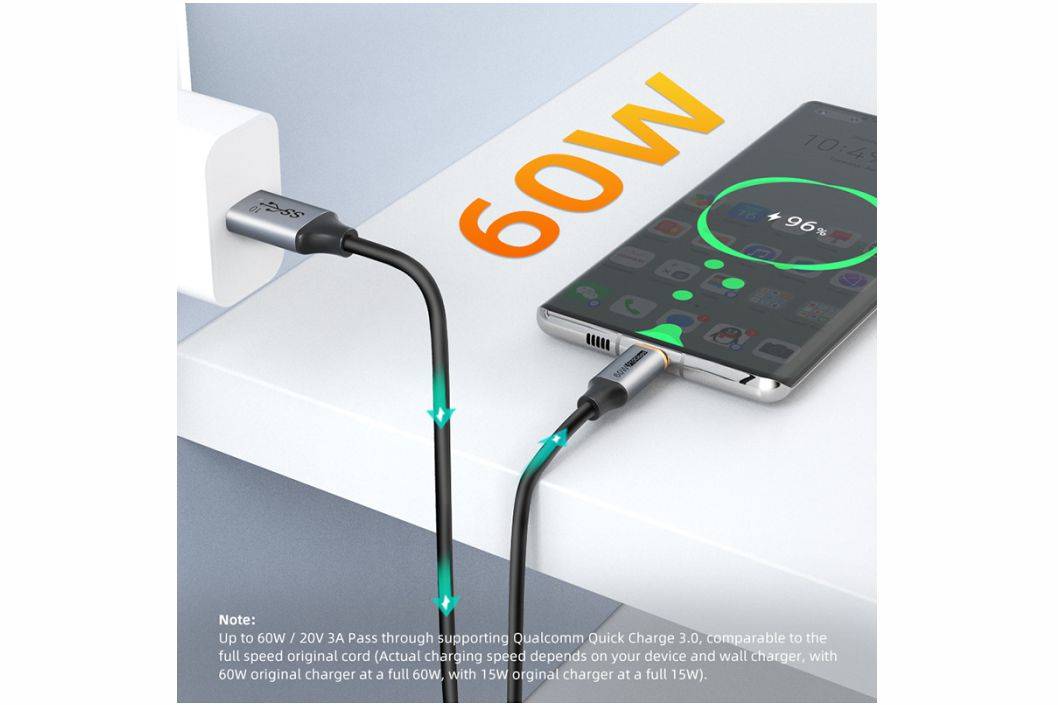 Mendukung QC3.0, dengan daya keluaran hingga 3A/20V dan pengisian daya yang super cepat hingga 60W