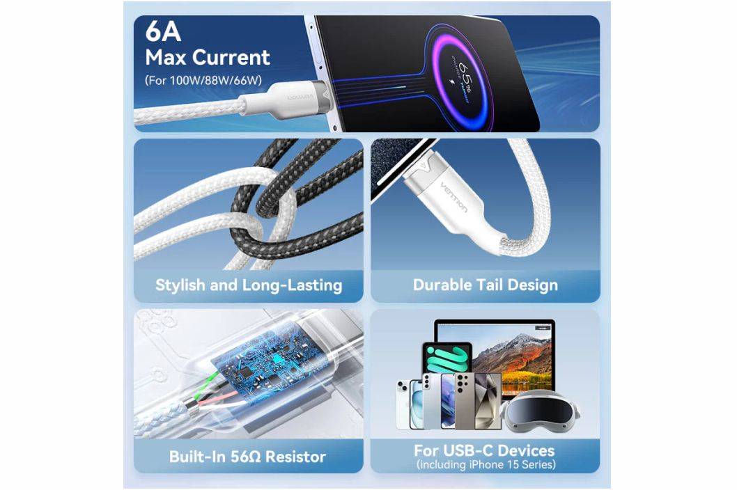 FEATURES: 🔹High Current 6A 🔹Transfer Speed 480Mbps 🔹Flexible & Crack-Resistant 🔹100W/88W/60W Fast Charging, AFC/FCP/QC 🔹Compatible for IPhone 15, Support Apple Carplay 🔹Universal Compability, Support device port USB C