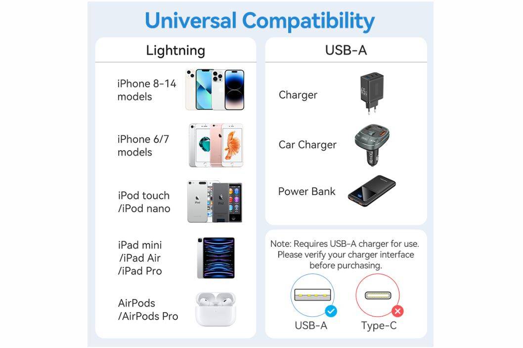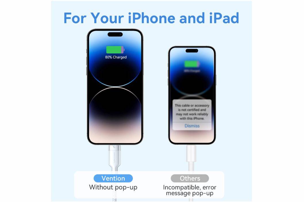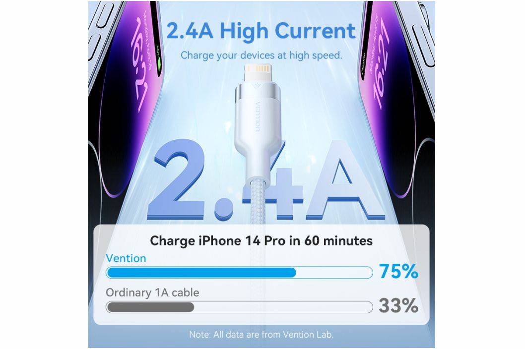 SPECIFICATIONS:Brand : VentionProduct : USB A 2.0 to LightningConductor : Tinned CopperInterface : USB-A Male/Lightning MaleElectroplating Process : Nickel-PlatedData Transfer Rates : 480MbpsRated Current : 2.4AShell : Aluminium Alloy + PVCShielding : Aluminum FoilJacket : PVC + Nylon BraidedLength : 1m/2mColor : Black