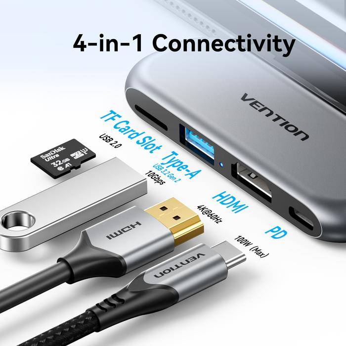 SPECIFICATIONS: 🔹 Brand: Vention 🔹 Product: 4-in-1 USB-C Cable-Free Docking Station 🔹 Model: THY 🔹 Color: Gray 🔹 Interface: USB-C / HDMI / USB 3.2 Gen 2 Type-A / TF / PD 🔹 Electroplating Process: Nickel-Plated 🔹 Shell: Aluminum Alloy 🔹 Resolution: 4K@60Hz (HDMI Output) 🔹 Transmission Rate: 10Gbps (USB 3.2 Gen 2 Type-A) 🔹 Card Slot Type: TF 1-LUN (Read/Write satu kartu dalam satu waktu) 🔹 Card Slot Speed: USB 2.0 🔹 Power Supply: PD 100W Max 🔹 Packaging: Color Box