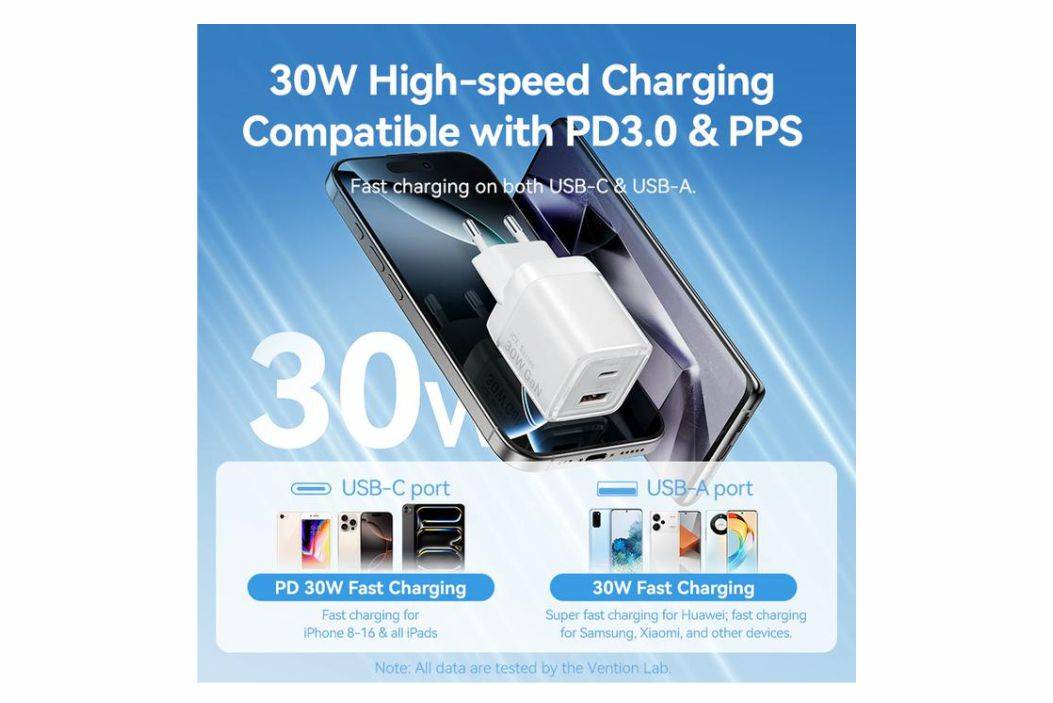 SPECIFICATIONS : 🔹Brand : Vention 🔹Product : 30W GaN Charger 🔹Color : Gray/Pink/White 🔹Material : PC 🔹Interface : USB-A/USB-C 🔹Input : 100-240V~50Hz/60Hz 1.0A Max 🔹Output USB-A : 5V=3A; 9V=3A; 12V=2.5A;20V=1.5A 30.0W Max 🔹Output USB-C : 5V-3A; 9V-3A; 12V-2.5A; 15V-2A;20V-1.5A 30.0W Max 🔹Output USB-A+USB-C : 5V-3A 15.0W Max 🔹Total Output : 30W 🔹USB-C Protocols : PD 3.0/PPS/ QC 3.0/ FCP/ AFC/ Apple 2.4 🔹USB-A Protocols : QC 3.0/ FCP/ AFC/ Apple 2.4