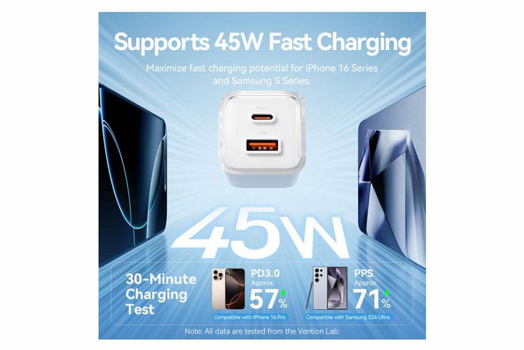 SPECIFICATIONS : 🔹Brand : Vention 🔹Product : 70W GaN Charger 🔹Color : Gray/Pink/White 🔹Material : PC 🔹Interface : USB-A/USB-C 🔹Input : 110-240V~50Hz/60Hz 1.8A Max 🔹Output USB-A : 5V=3A; 9V=2A; 10V=2.25A;12V=1.5A 22.5W Max 🔹Output USB-C : 5V-3A; 9V-3A; 10V-2A; 12V-3A;15V=3A; 20V=3.5A 70.0W Max 🔹PPS : 3.3~11V-5A 55W Max 🔹PPS2 : 3.3~21V=3A 63W Max 🔹Output USB-A+USB-C : 15.0W+45.0W