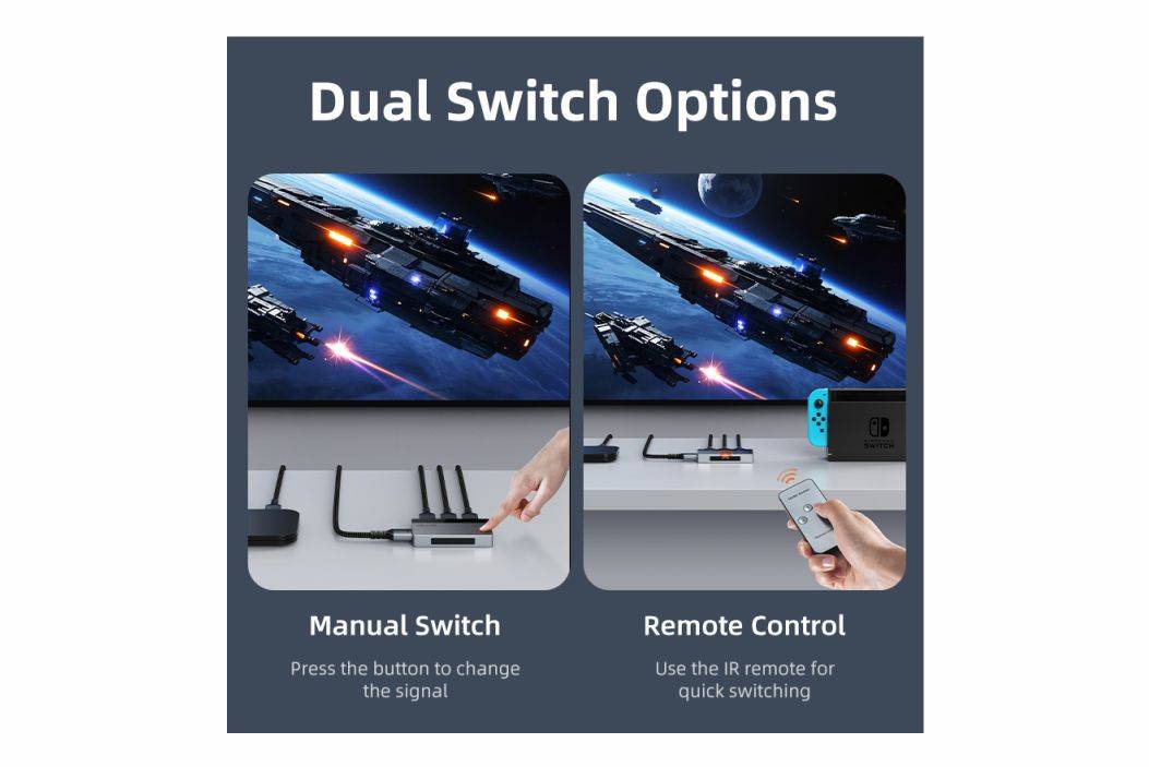 Switcher HDMI 3-in-1 ini memberikan semua kontrol yang butuhkan. Seperti remote untuk mengganti antara 3 input HDMI hanya dengan menekan tombol ke 1 Output HDMI